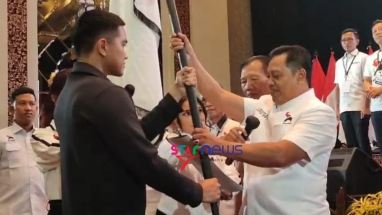 Kaesang menyerahkan bendera Pataka kepada Wayan Suyasa dan menitipkan PSI Bali kepada Wayan Suyasa sebagai Ketua DPW PSI Bali.